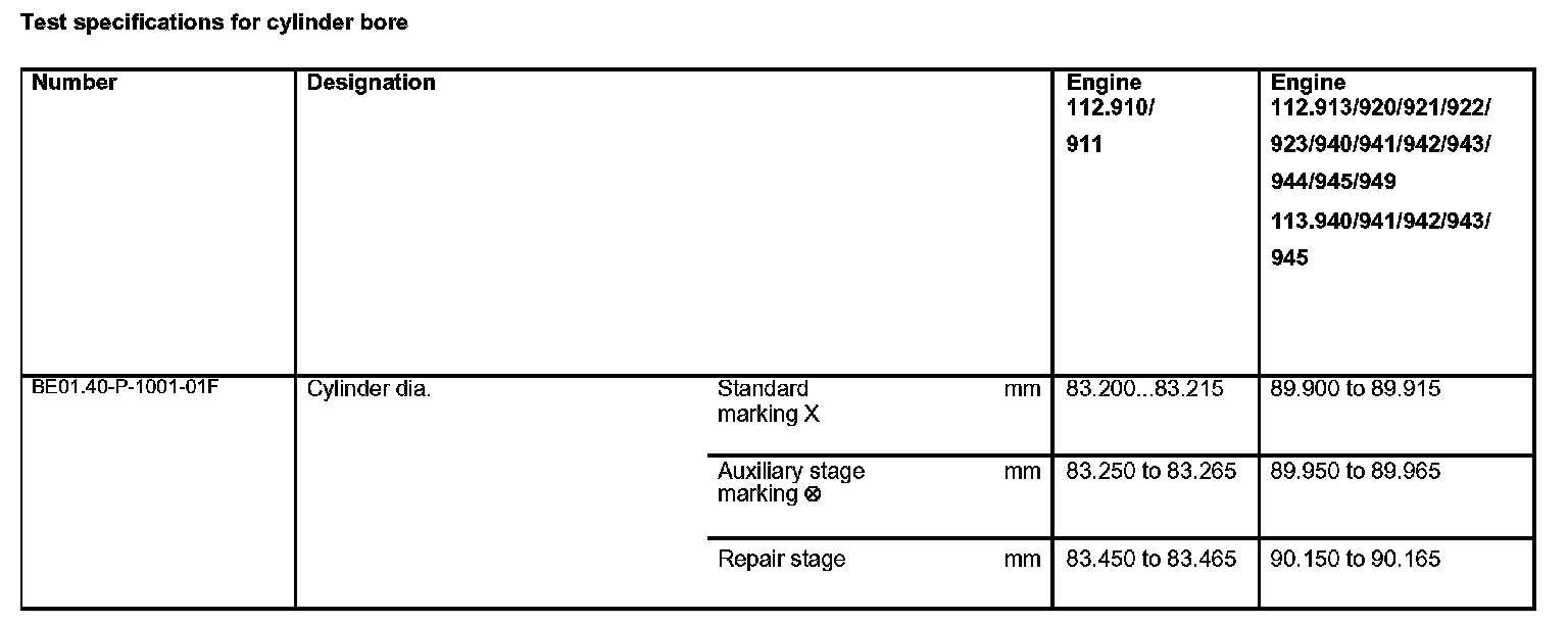 2 The cylinder bore diameter on engines 112, 113 is stated in two tolerances. The two tolerances of the cylinder bore diameters are distinguished one from the other by the letters "x" and "(x)".
