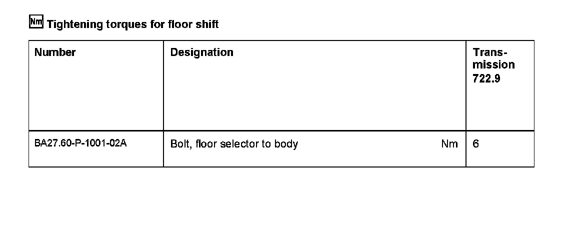 Tightening torques for floor shift: