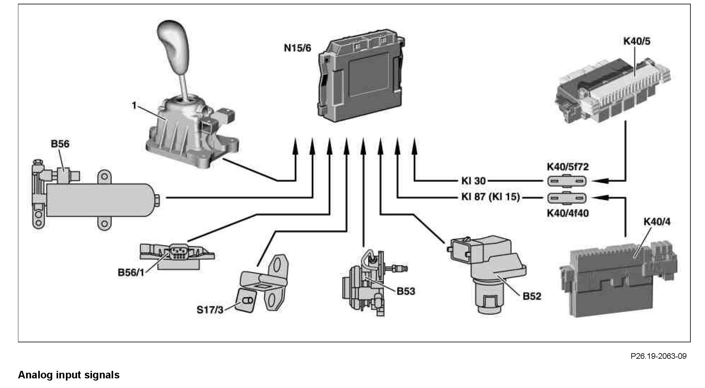 Only the automated manual transmission control unit (N15/6) is responsible for calculating the shift engagements and clutch engagements from the analog sensor values received of gear recognition, clutch speed, clutch travel, shift desired and pressure value of hydraulic fluid.
