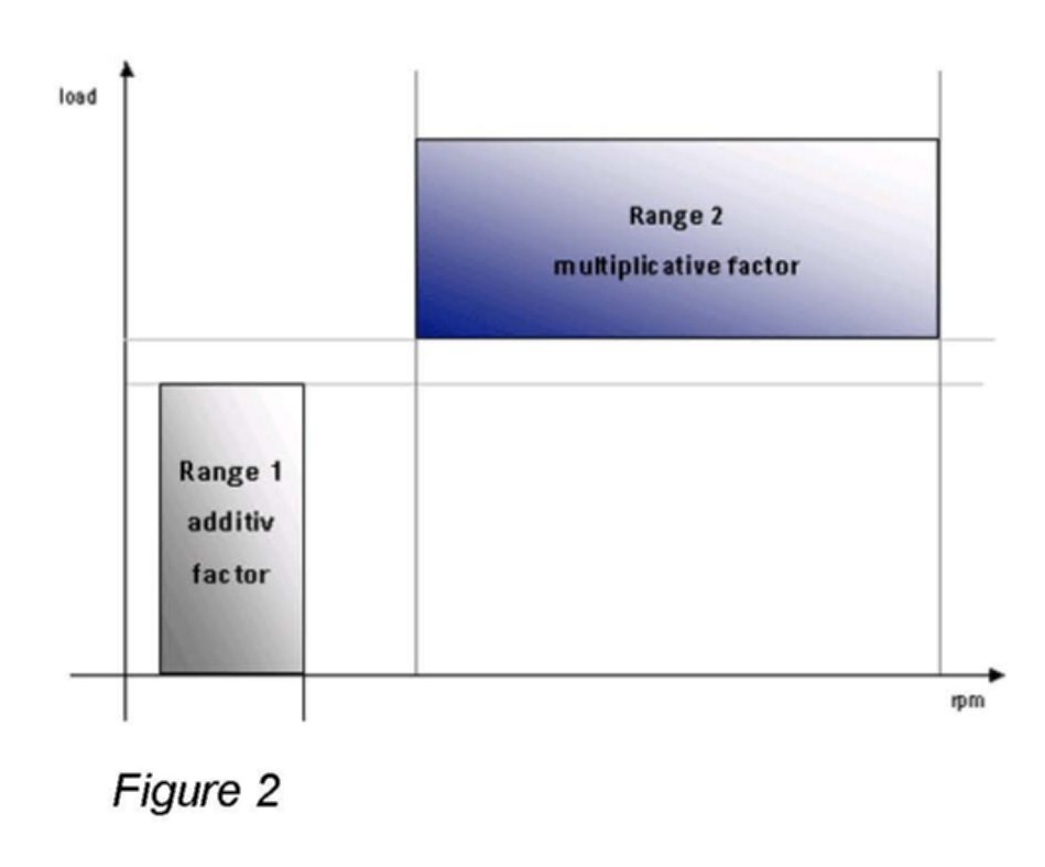 In the idle speed range, the additive factor can also be affected by the multiplicative factor. For example, if the multiplicative factor (adapted in range 2) at idle speed is too large, the additive factor (adapted in range 1) will adapt in a negative direction.