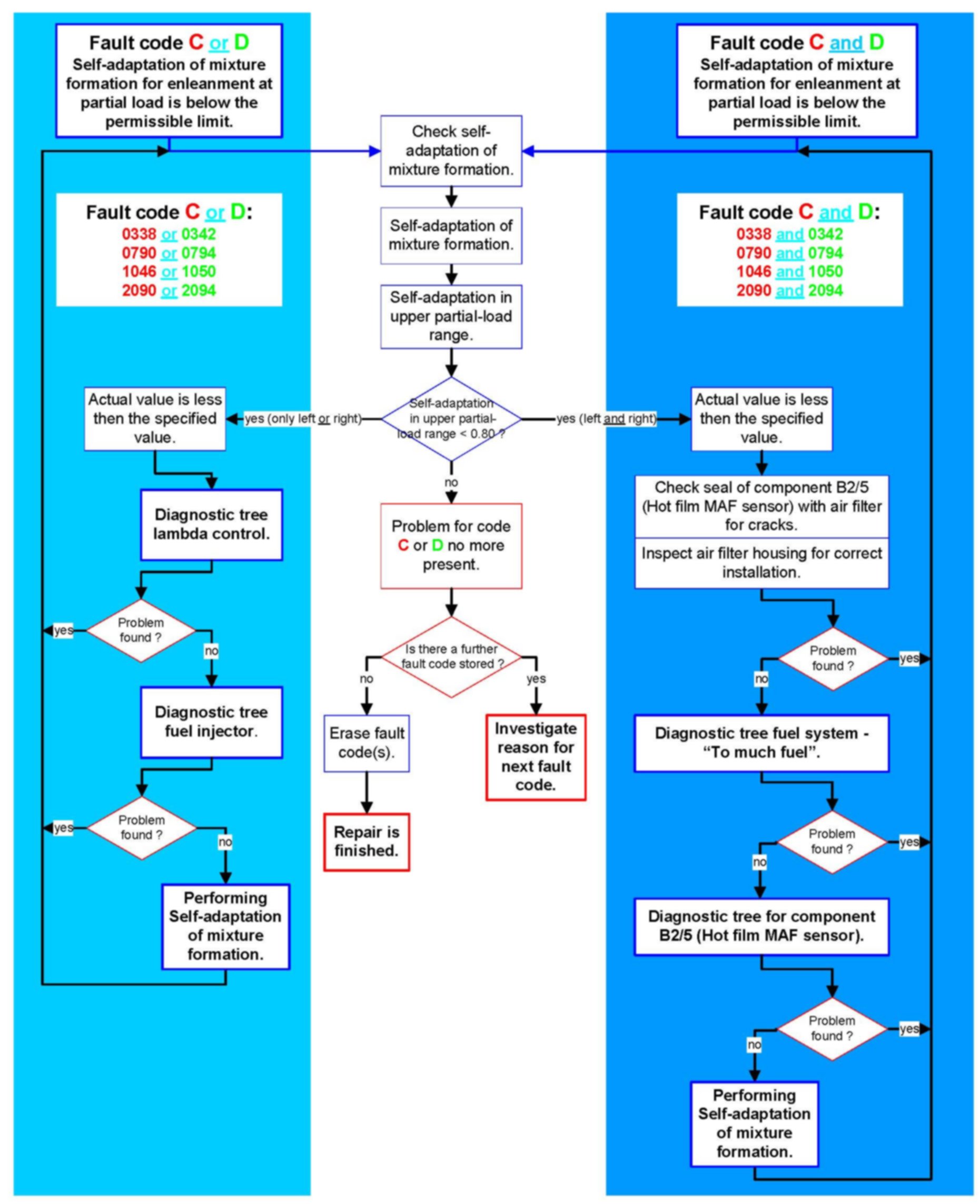 In the case of an adaptation mixture formation fault code on both cylinder banks please check the following: