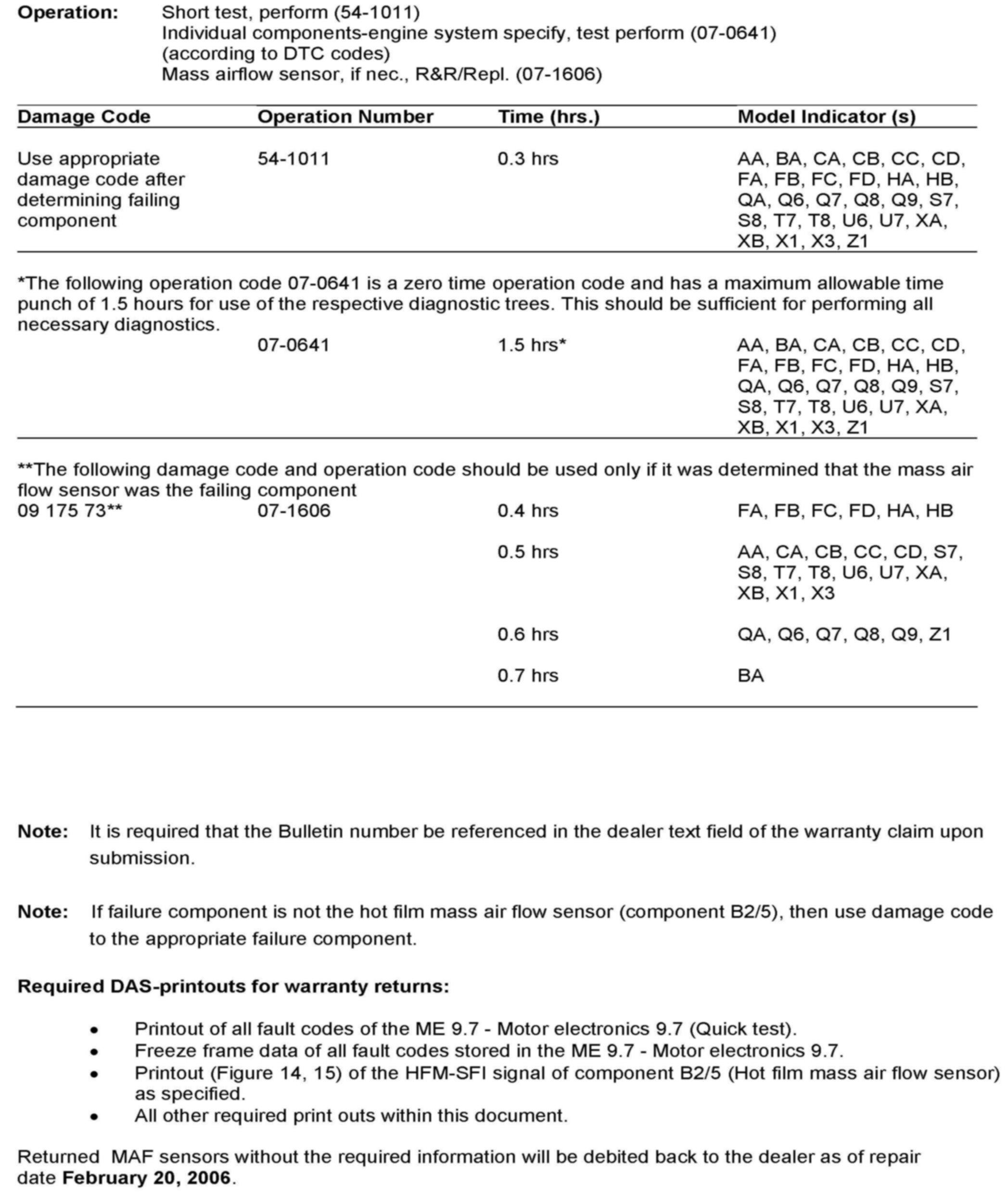 ^ Returned hot film mass air flow sensor (component B2/5) without the required information will be debited back to the dealer as of repair date February 20, 2006.