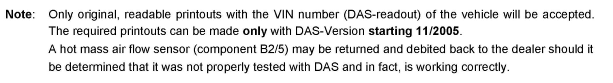 Only original, readable printouts with the VIN number (DAS-readout) of the vehicle will be accepted. The required printouts can be made only with DAS-Version starting 11/2005. A hot mass air flow sensor (component B2/5) may be returned and debited back to the dealer should it be determined that it was not properly tested with DAS and in fact, is working correctly.