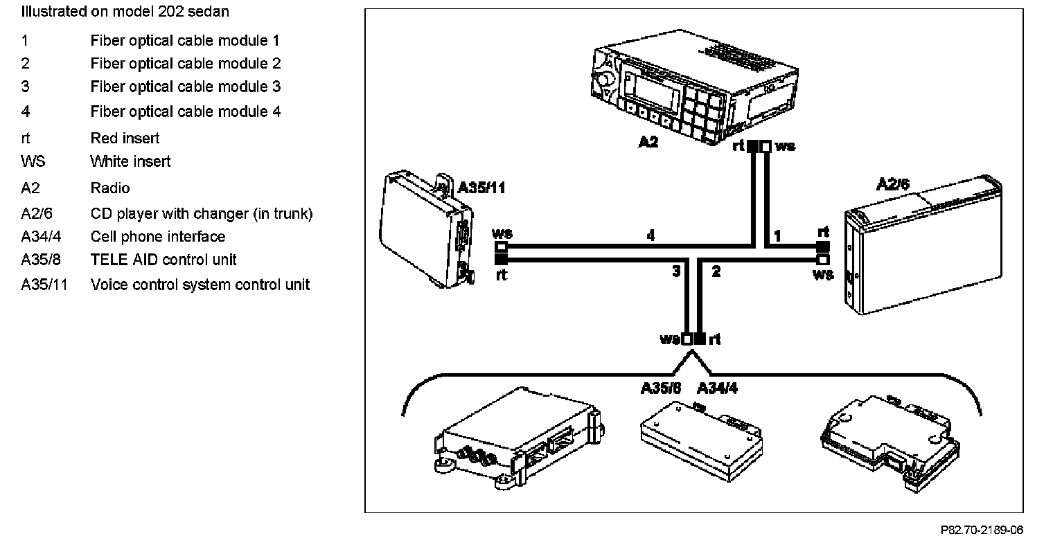 For vehicle models 170, 202, 203, 208, 210, 215, 220, 230, 463 an identification plate is located on the fiber optical cable wiring harness behind the radio on which the fiber optical cable modules (1, 2, 3, 4) specially fitted to these vehicles are specified together with their exact length.