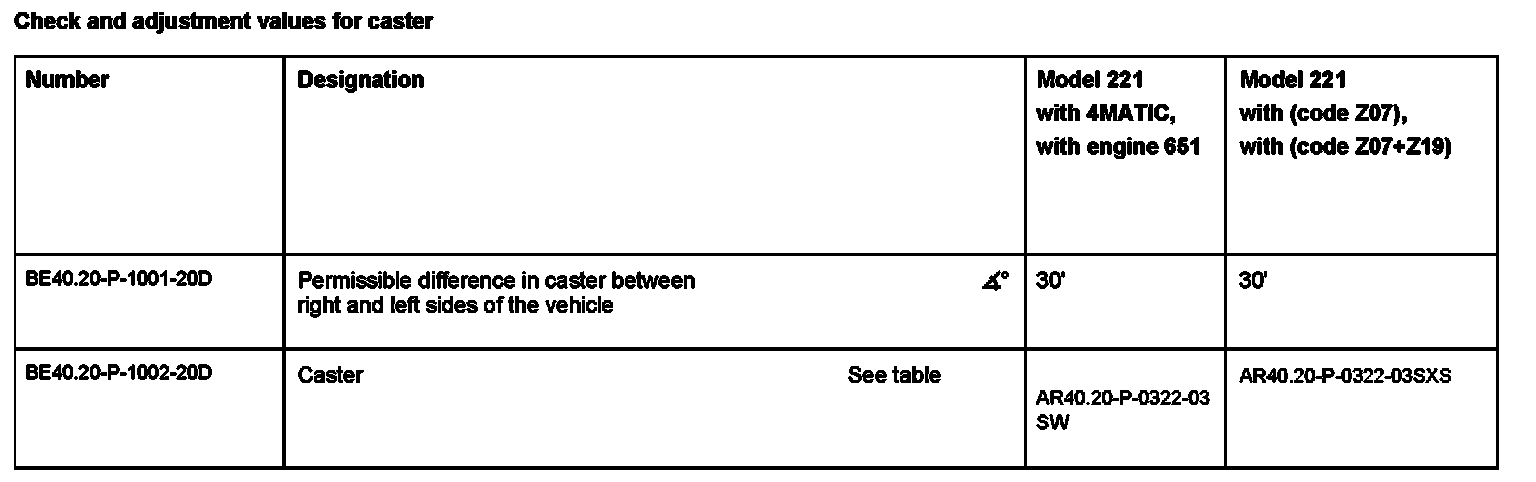Check and adjustment values for caster: