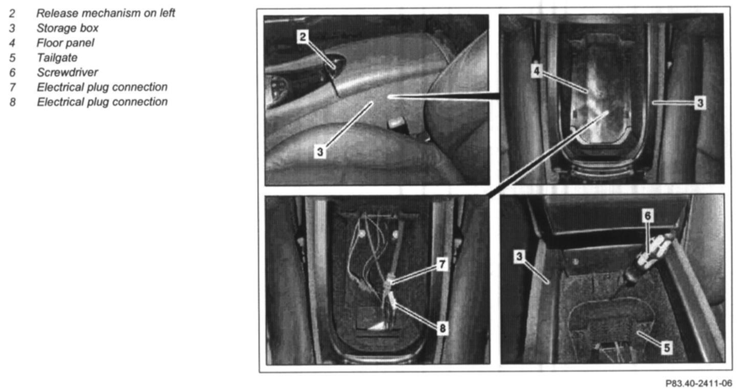 4 Unclip rear wall (5) of the stowage box (3) using a screwdriver (6)