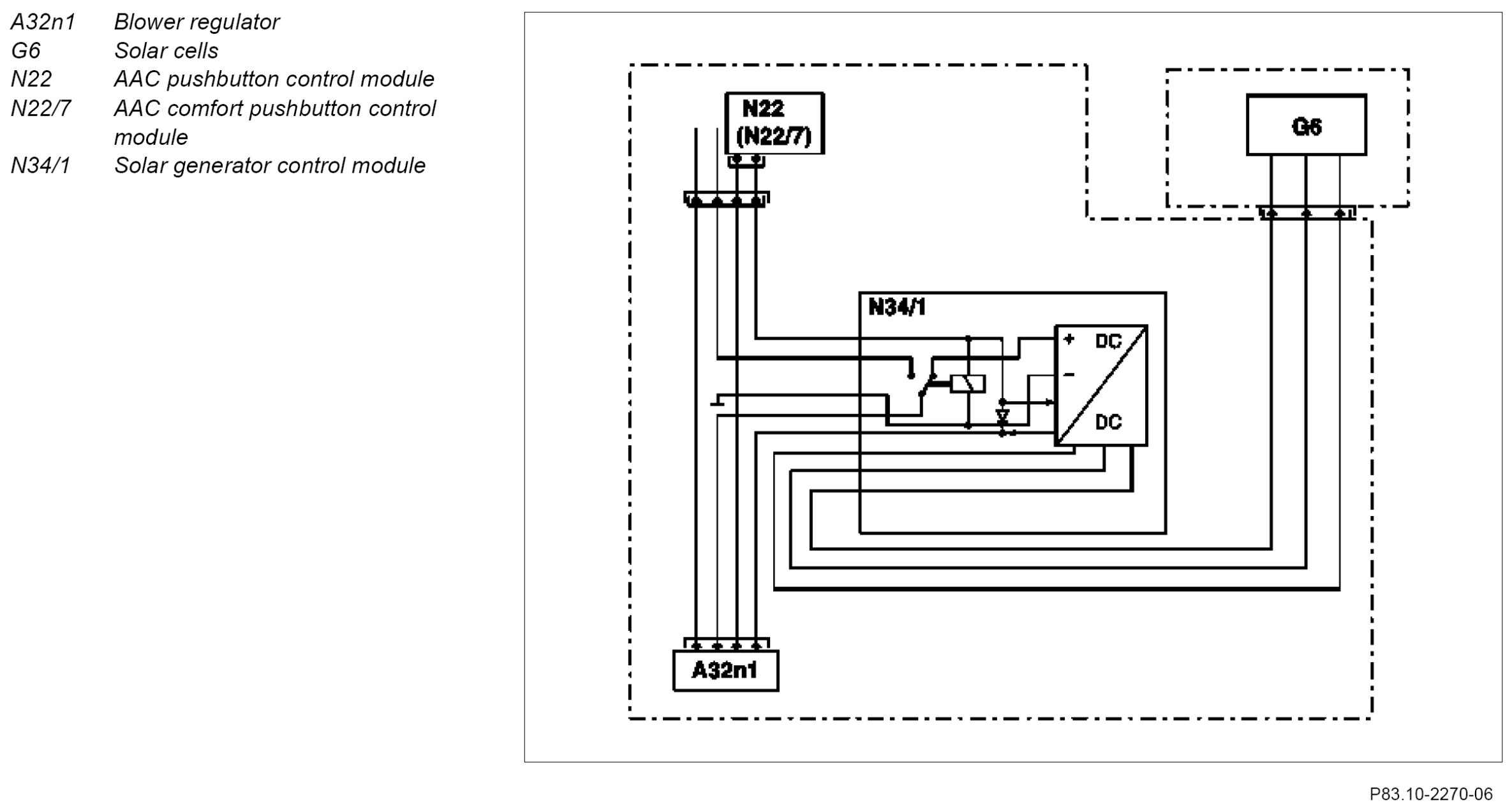 The solar generator control unit (N34/1) supplies solar current from the solar cells (G6) of the top sliding roof via the blower regulator (A32n1) into the blower motor (A32m1). In the process a sun power of P = 500 W on the surface of the solar cells (G6) corresponds to approx. P = 50 W power output at the blower motor. The solar current is fed in by a relay in the supply line of the blower motor (A32m1).