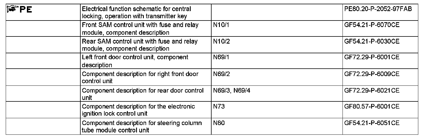 The front SAM control unit locks or unlocks the left rear door lock (A85/3) over the left rear door central locking motor (A85/3m1) and the right rear door lock (A85/4) over the right rear door central locking motor (A85/4m1).
