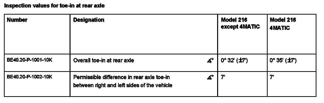 Inspection values for toe-in at rear axle: