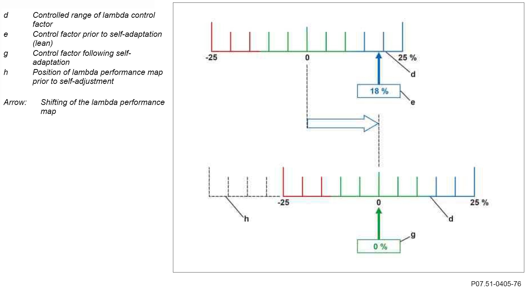 If the mixture composition constantly drifts out of the middle control range (e.g. 0 ± 10%), the ME-SFI [ME] control unit shifts the lambda map under certain operating conditions sufficiently far until a lambda control factor of approx. 0% (g) is again achieved.