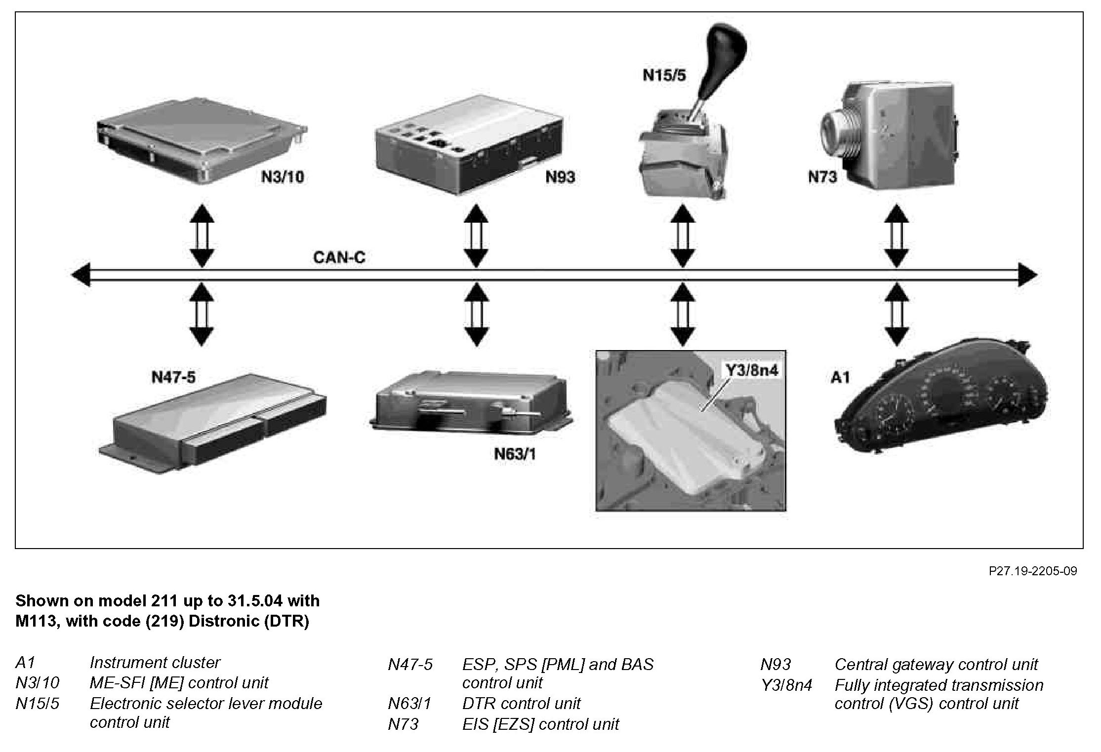 The electronic selector lever module control unit (N15/5) receives digital and analog input signals, converts these and actuates various components or transmits information to various control units via the Controller Area Network bus class C (engine compartment) (CAN-C).