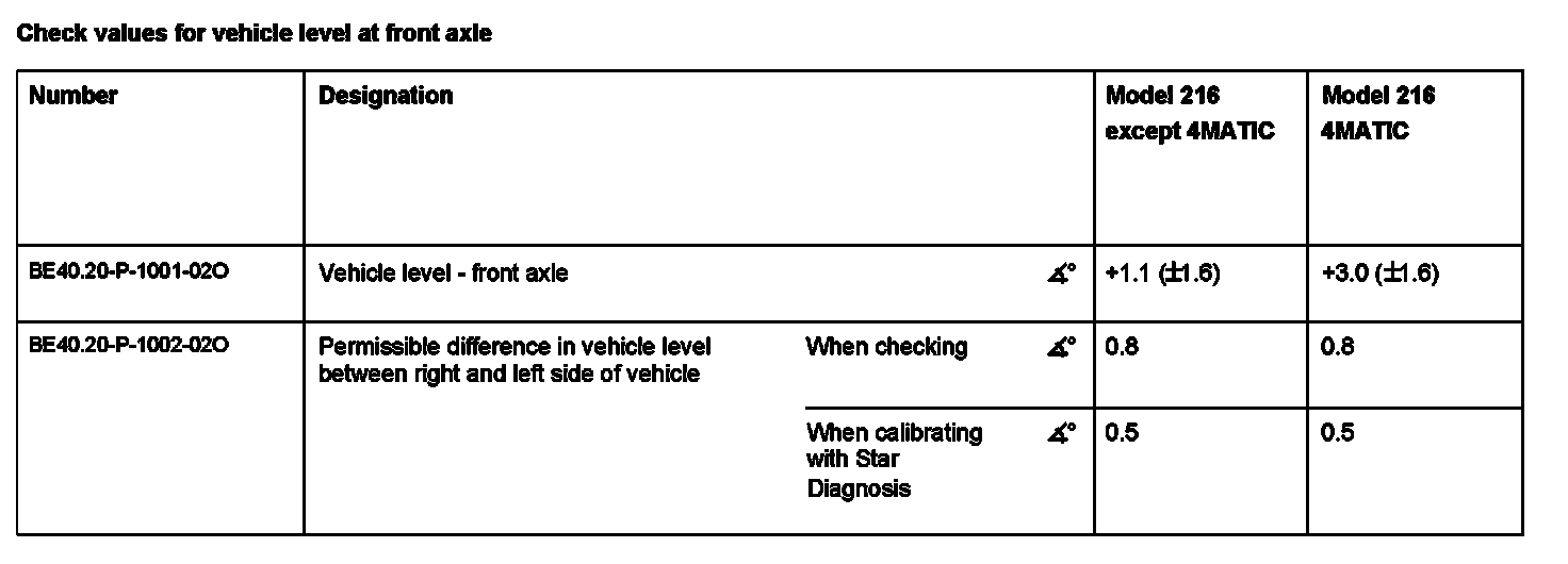 Check values for vehicle level at front axle: