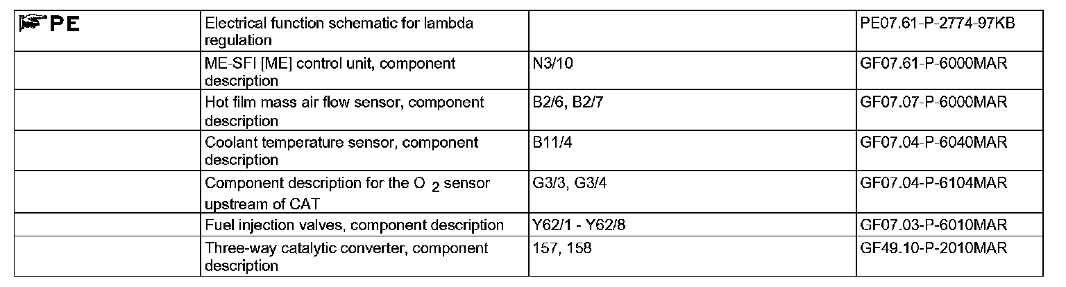 The mixture composition is controlled within the narrowest limits around lambda= 1 in order to achieve high conversion of the exhaust gases (exhaust gas conversion) in the catalytic converters. For this purpose, the ME-SFI control unit (N3/10) reads the following sensors: