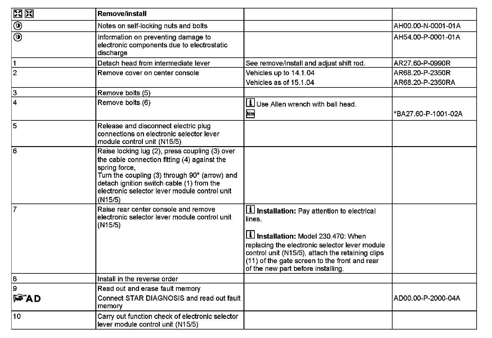 AR27.60-P-0901RA Remove/install electronic selector lever module (ESM)
