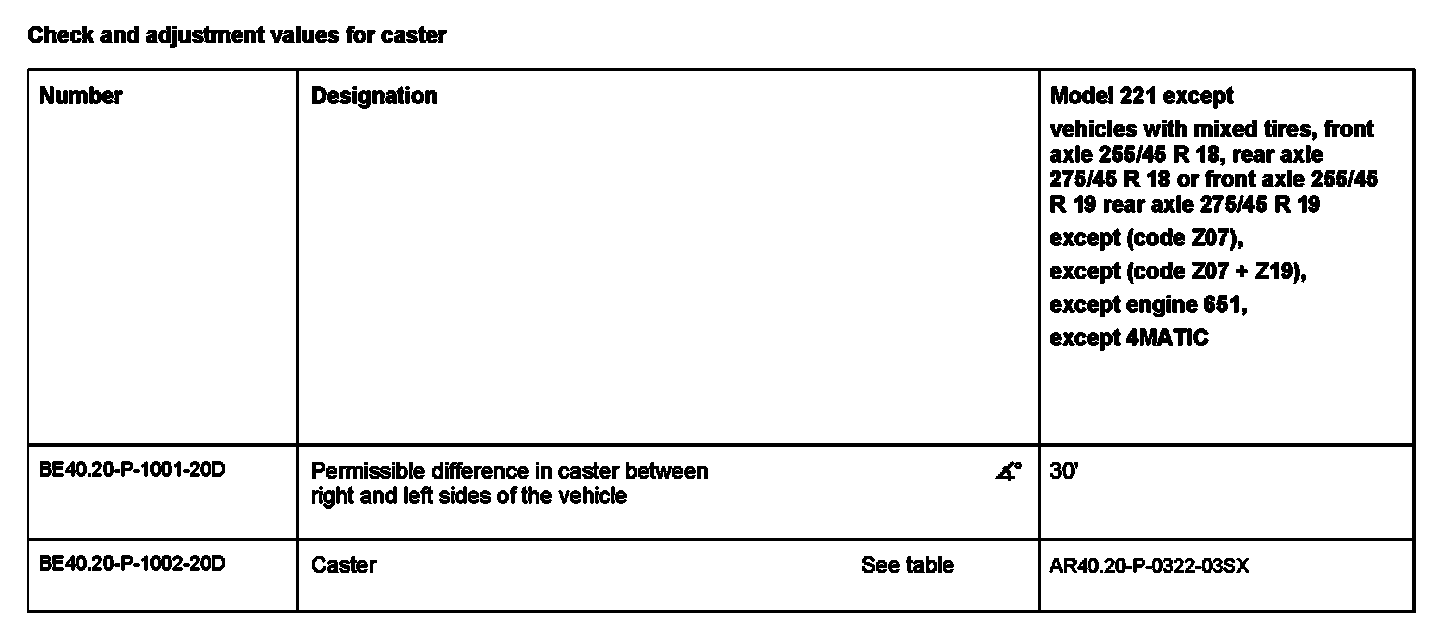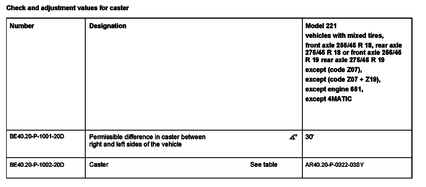 Check and adjustment values for caster: