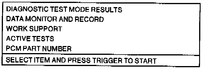DIAGNOSTIC TEST MODE RESULTS will be the first item on this screen, and it will be highlighted. This is the function needed to retrieve diagnostic trouble codes in Test Step QT4 and QT5. Press TRIGGER. Screen Display #10 will appear.