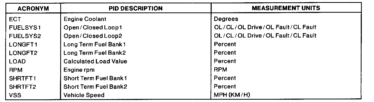 Freeze Frame Data allows access to emission related values from specific generic PIDs. These values are stored the instant an emission related Diagnostic Trouble Code (DTC) is stored in continuous memory. This provides a snapshot of the conditions that were present when the DTC was stored. Once one set of freeze frame data is stored, this data will remain in memory even if another emission related DTC is stored, with the exception of misfire or fuel system DTCs. Once freeze frame data for misfire or fuel system DTC is stored, it will overwrite any previous data and freeze frame will not be further overwritten. When a DTC associated with the freeze frame is erased or a Powertrain Control Module (PCM) memory reset is performed, new freeze frame data can be stored again. In the event of multiple emission related DTCs in memory, always note the DTC for the freeze frame data.Freeze Frame Data Access Table: