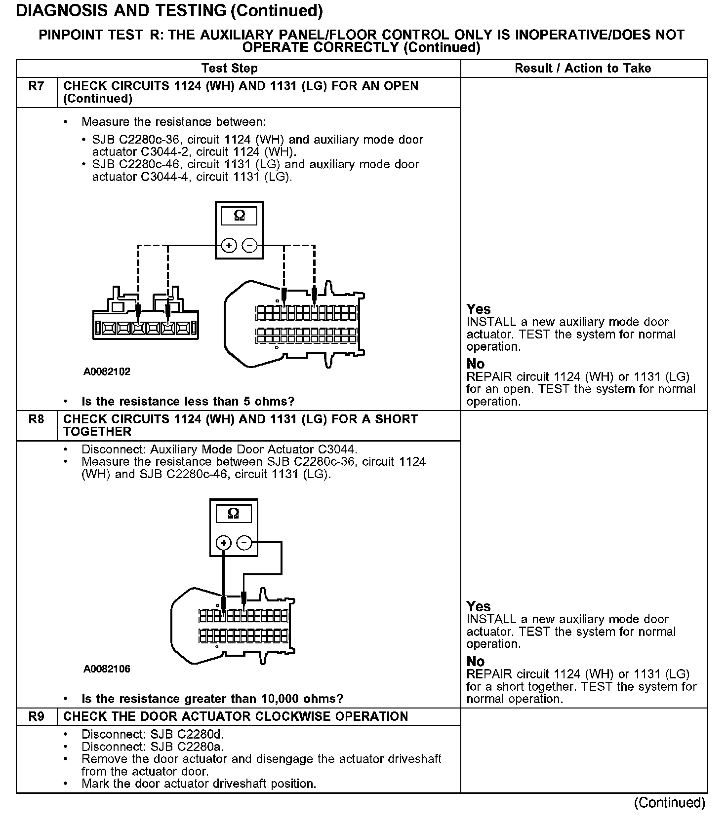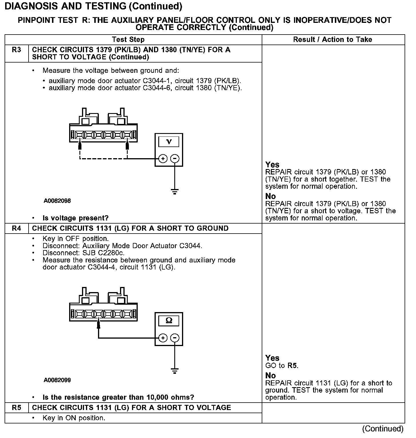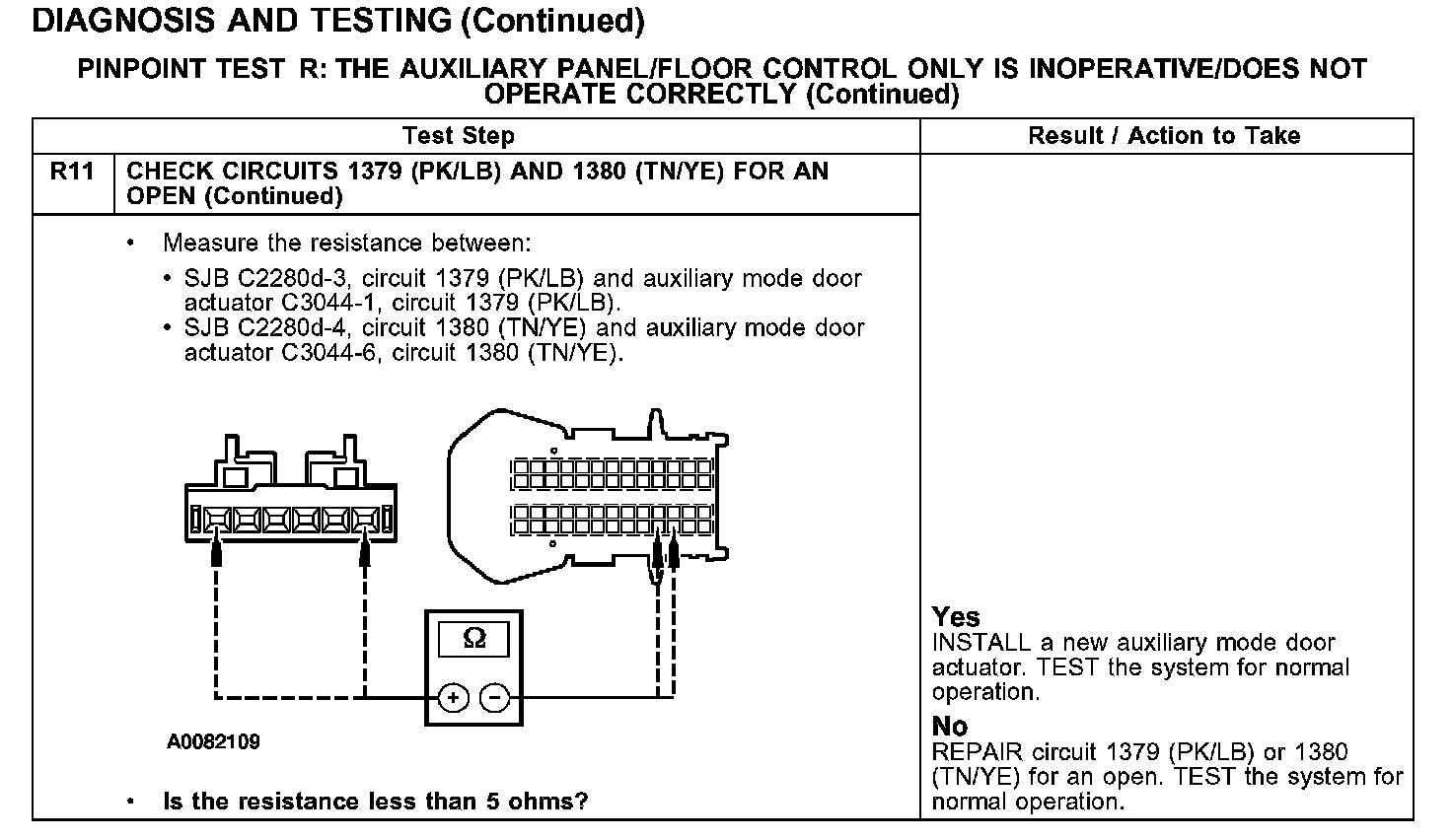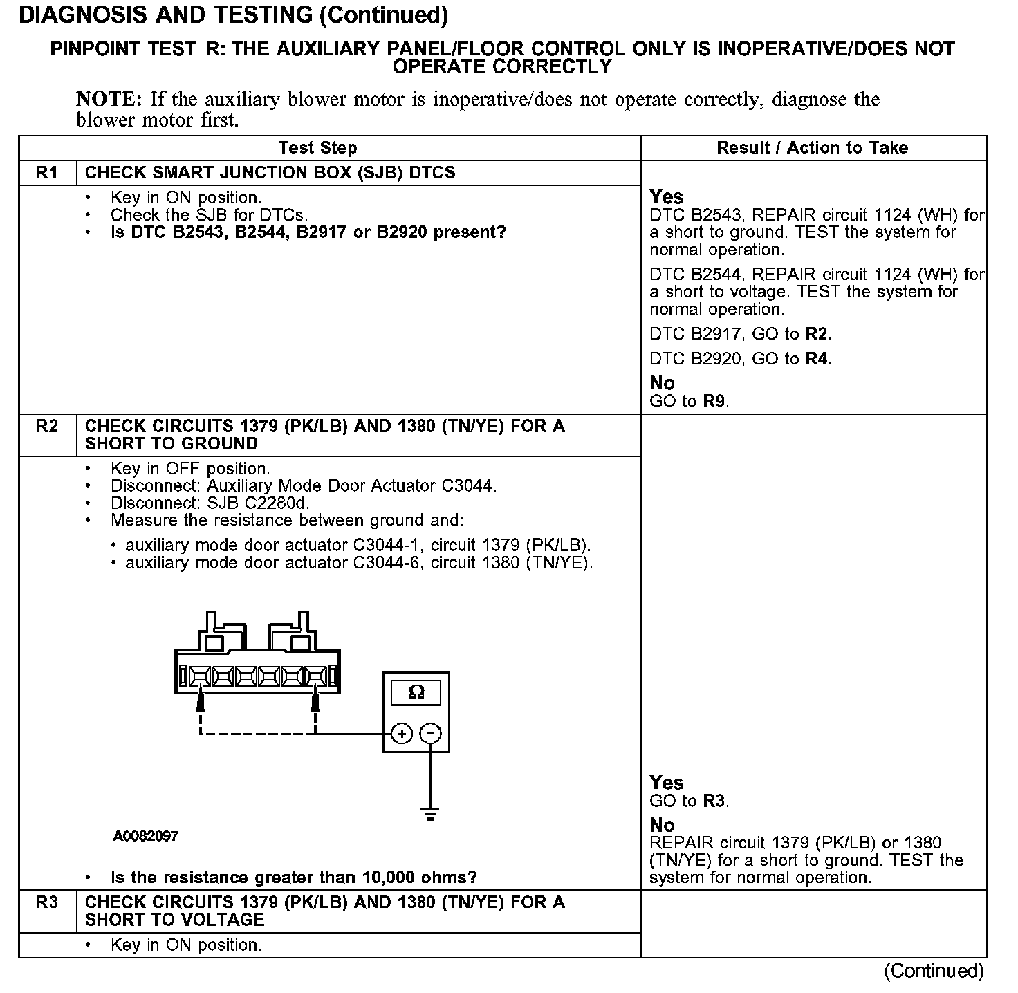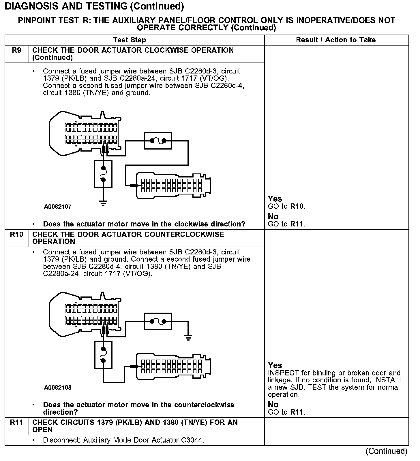 Under normal operation, to rotate the auxiliary temperature blend door actuator clockwise, the SJB supplies voltage to the auxiliary temperature blend door actuator motors through the circuit 1379 (PK/LB), and supplies ground through circuit 1380 (TN/YE). To rotate the auxiliary temperature blend door actuator counterclockwise, the SJB reverses the voltage and ground circuits.