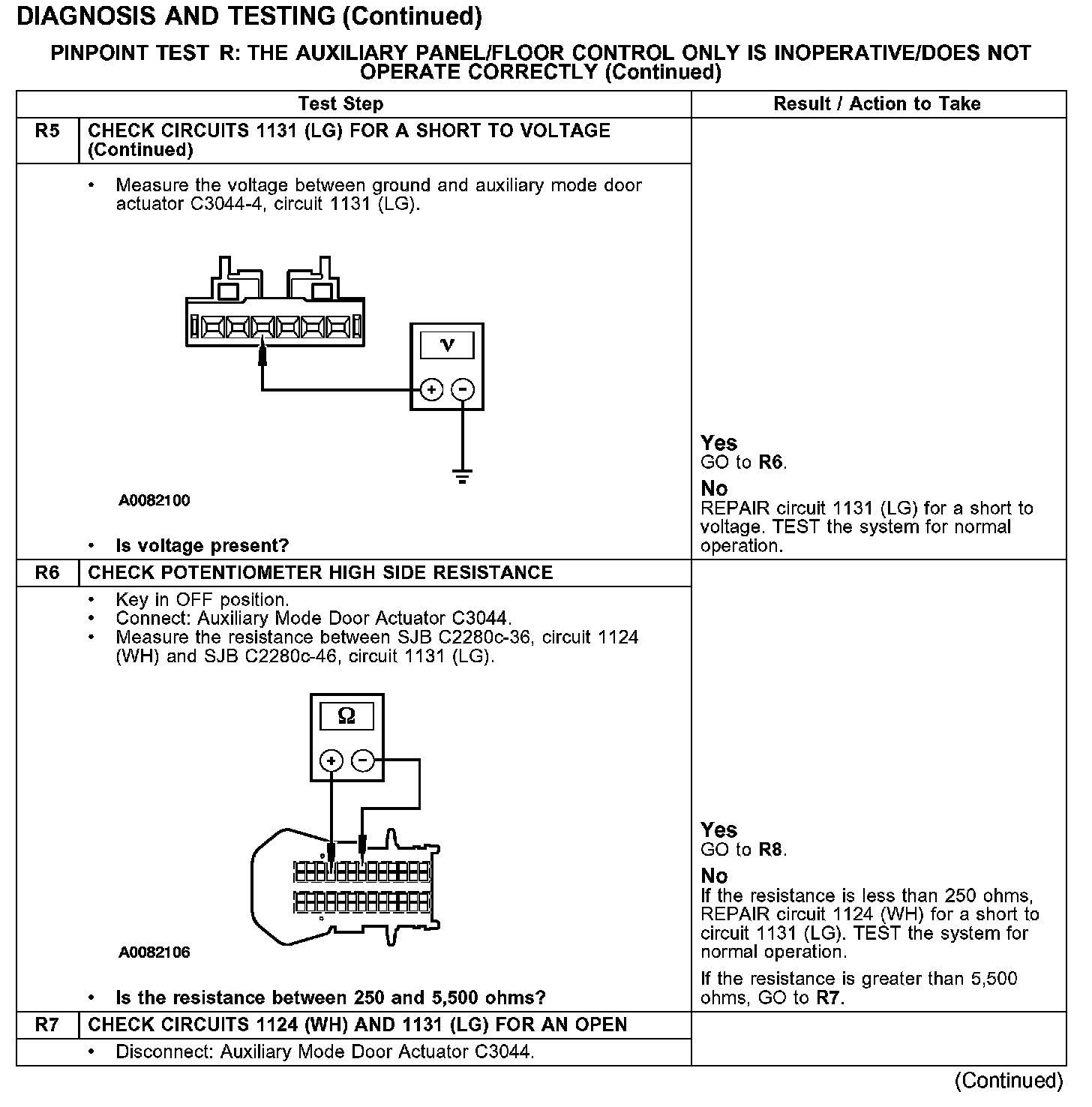 The auxiliary temperature blend door actuator feedback resistor is supplied a ground from the SJB through circuit 1125 (BN) and a 5-volt reference voltage on circuit 1124 (WH). The SJB reads the voltage on the auxiliary temperature blend door actuator feedback circuit 1131 (LG) to determine the auxiliary temperature blend door actuator position by the position of the actuator feedback resistor wiper arm.