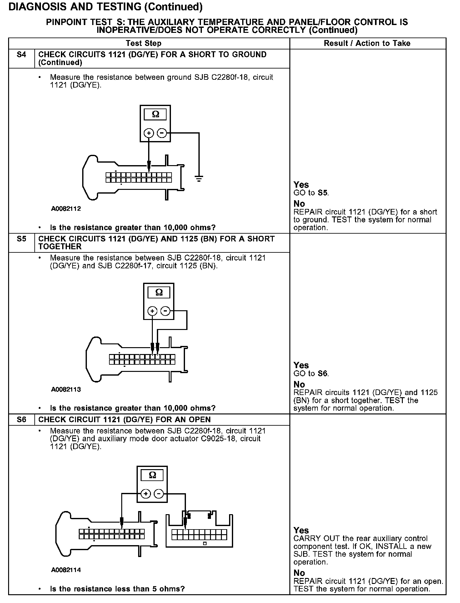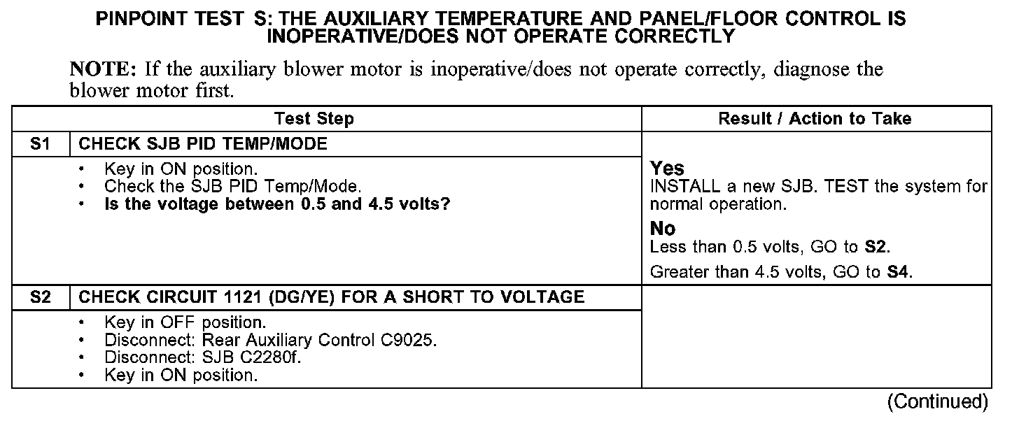 PINPOINT TEST S: THE AUXILIARY TEMPERATURE AND PANEL/FLOOR CONTROL IS INOPERATIVE/DOES NOT OPERATE CORRECTLYTest S1-S2: