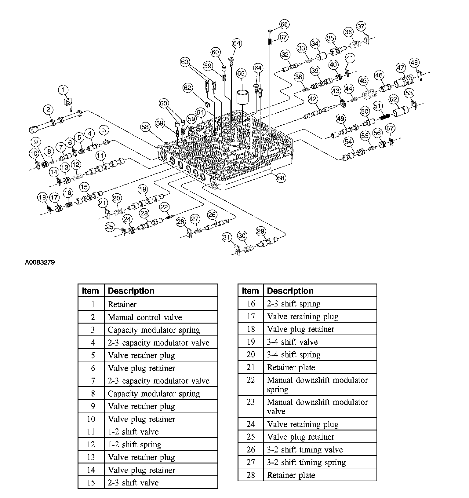 6. CAUTION: Most valves are aluminum and cannot be removed using a magnet. Remove the valves by tapping valve body on the palm of the hand to slide the valves out of the bores. It may be necessary to remove the valves and springs using a pick. If it is necessary to use a pick, use extreme caution to prevent damaging the valves or valve bores. If necessary, disassemble parts of the main control valve body in small groups. Take special care when handling the main control components, since they are the most precise and delicate parts of the transaxle. Neatly arrange the parts as they are removed to avoid mixing similar pieces.
