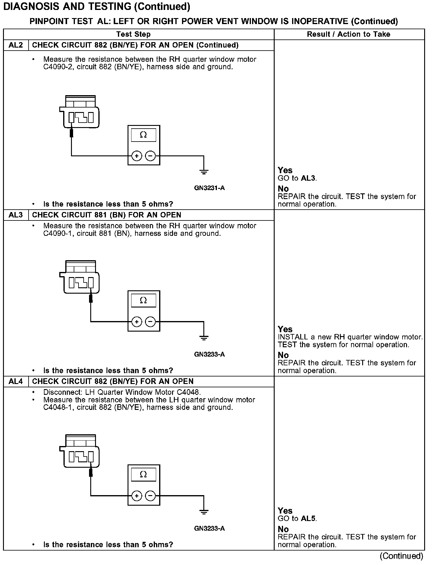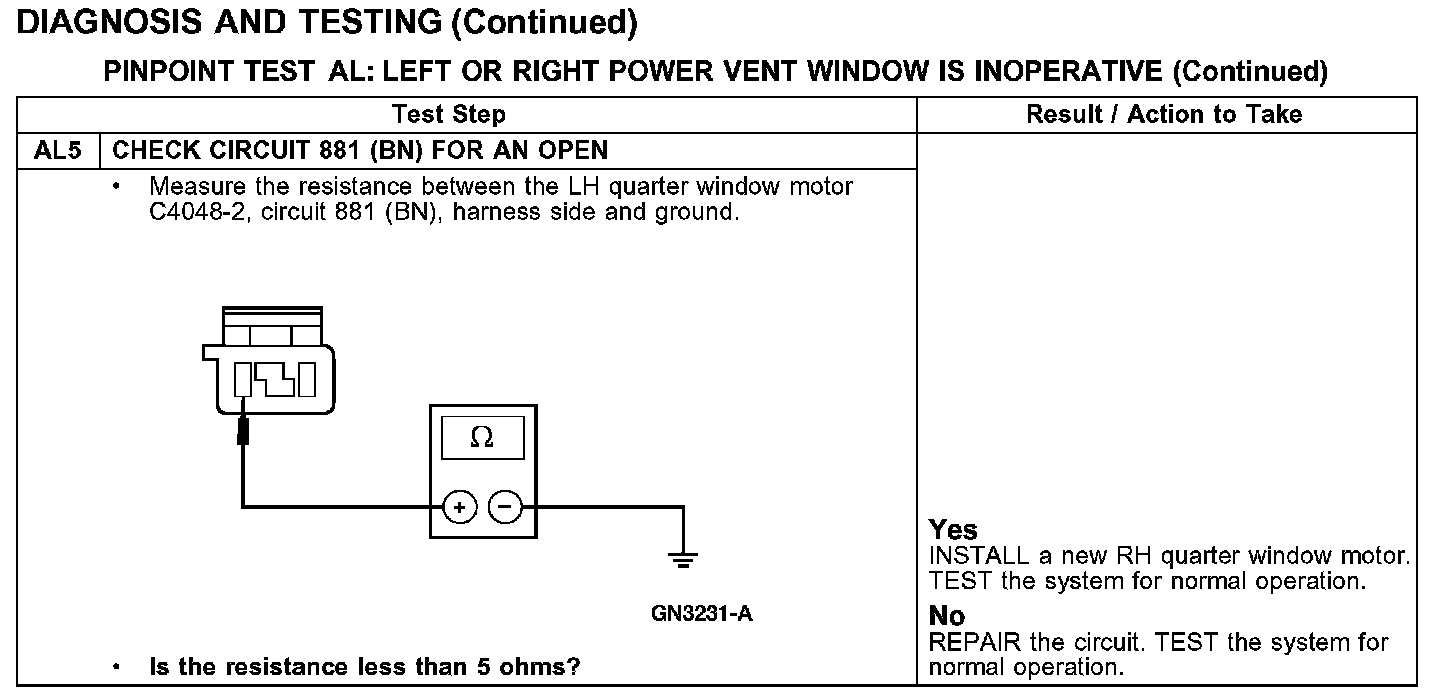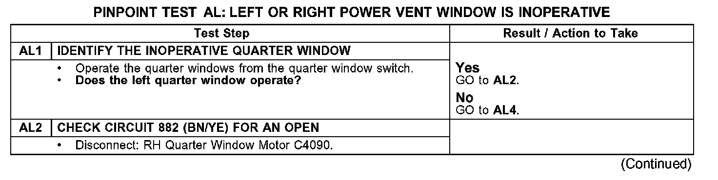 PINPOINT TEST AL: LEFT OR RIGHT POWER VENT WINDOW IS INOPERATIVETest AL1-AL2: