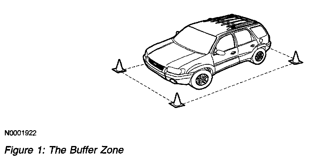 NOTE: The buffer zone is required only when working with the high-voltage components or cables. Position 4 orange safety cones around the corners of the vehicle to mark off a 1 meter (3 feet) perimeter around the vehicle.