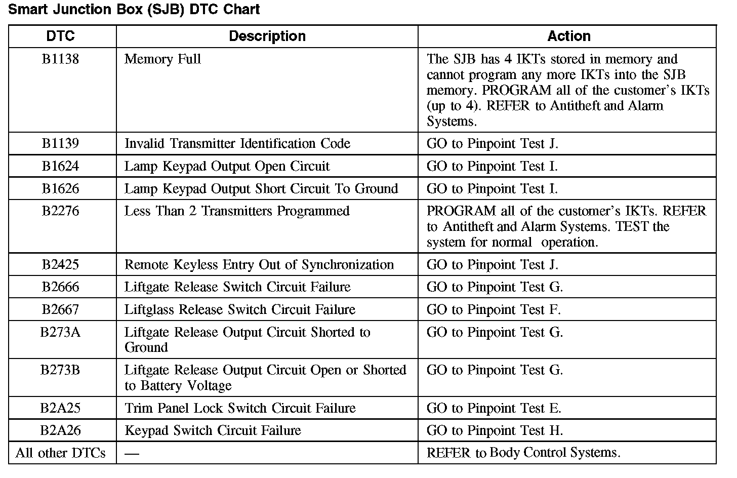 Smart Junction Box (SJB) DTC Chart