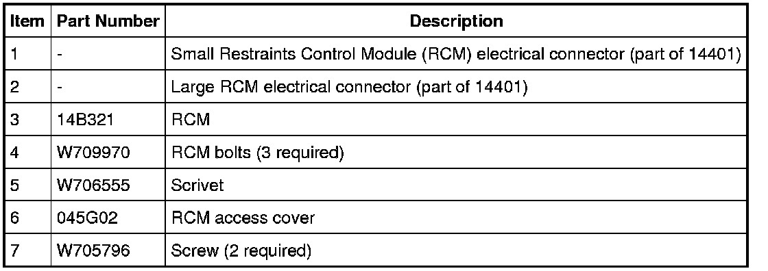 1. WARNING: Always tighten the fasteners of the restraints control module (RCM) and impact sensor (if equipped) to the specified torque. Failure to do so may result in incorrect restraint system operation, which increases the risk of personal injury or death in a crash.