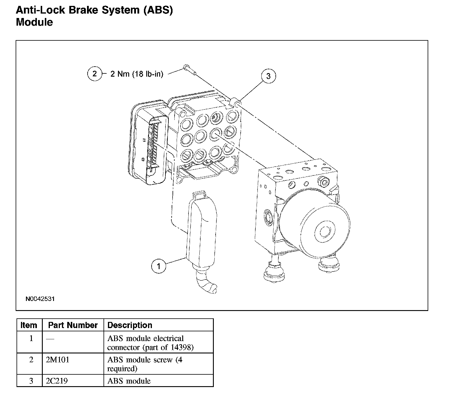 NOTE: When installing a new ABS module, it must be configured (using vehicle as-built data) and calibrated. Follow the scan tool directions for the calibration procedures. For module configuration, refer to Programmable Module Installation in Information Bus (Module Configuration).