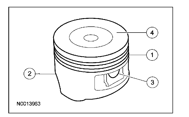 1. Clean and inspect the (1) ring lands, (2) skirts, (3) pin bosses and the (4) tops of the pistons. If wear marks, scores or glazing is found on the piston skirt, check for a bent or twisted connecting rod.