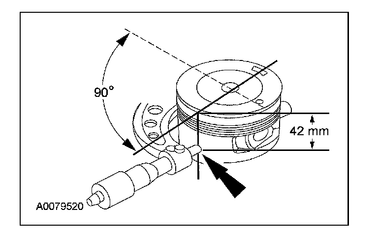 1. Measure the piston diameter 90 degrees from the piston pin and 42 mm (1.65 in) down from the top of the piston at the point indicated.