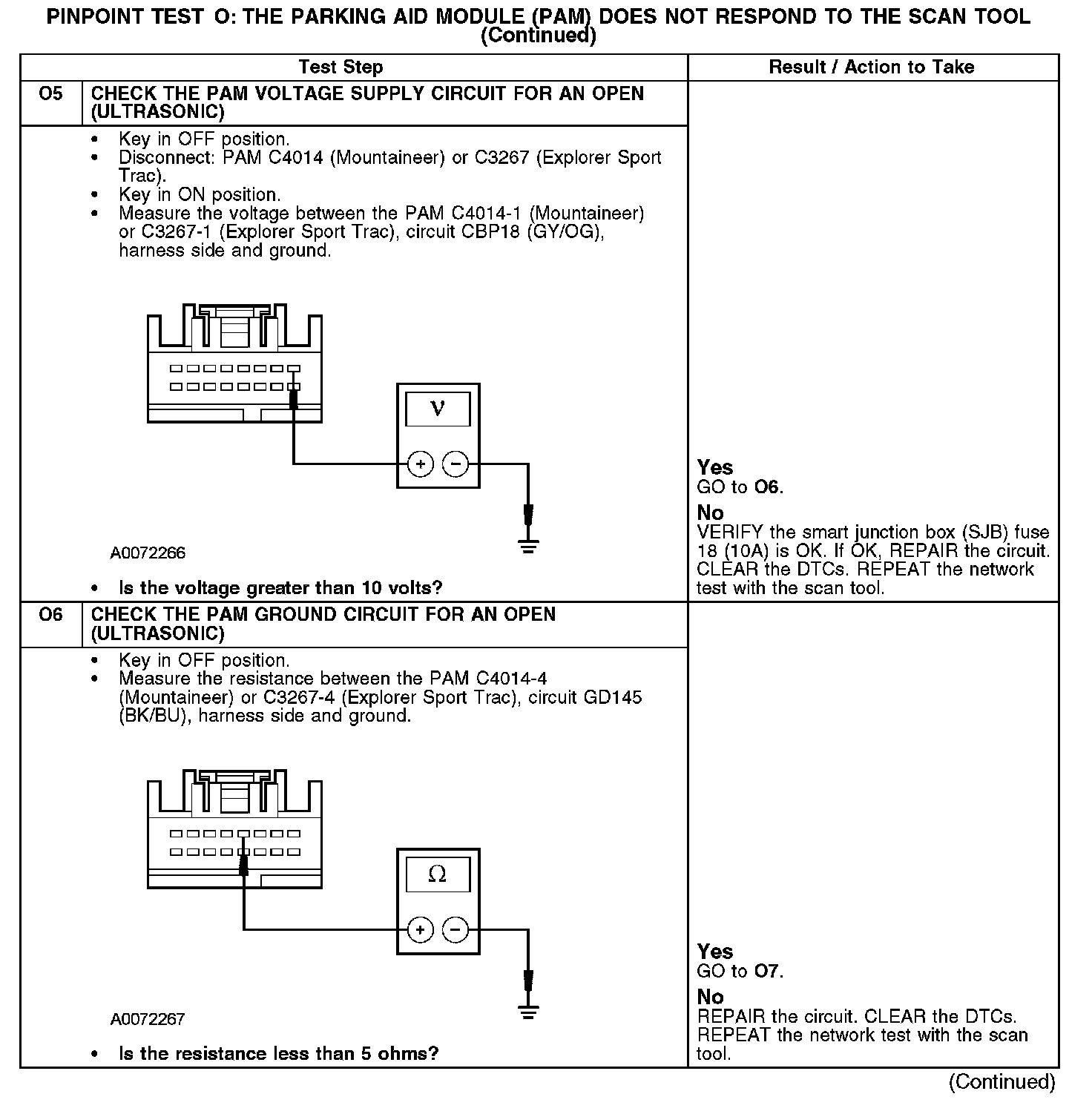The parking aid module (PAM) communicates with the scan tool through the medium speed controller area network (MS-CAN). Circuits VDB06 (GY/OG) (MS-CAN +) and VDB07 (VT/OG) (MS-CAN -) provide the network connection to the PAM. The PAM shares the MS-CAN with the instrument cluster (IC), the smart junction box (SJB), the heating ventilation air conditioning (HVAC) module (if equipped), the audio control module (ACM), the rear entertainment module (RETM) (if equipped), the satellite digital audio receiver system (SDARS) module (if equipped), and the power running board (PRB) module (if equipped). Voltage for the PAM is provided by circuit CBP18 (GY/OG). Circuit GD145 (BK/BU) provides ground.