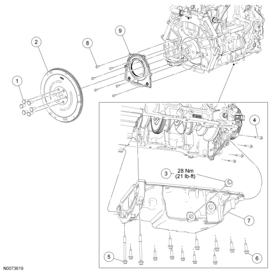 Lower End Components - Exploded View, Flexplate, Flywheel and Crankshaft Rear Seal