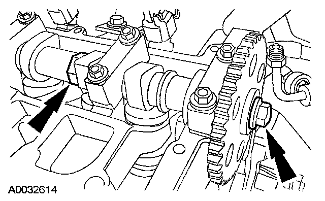 Using the flats on the camshaft to prevent camshaft rotation, remove the bolt and the exhaust camshaft sprocket.