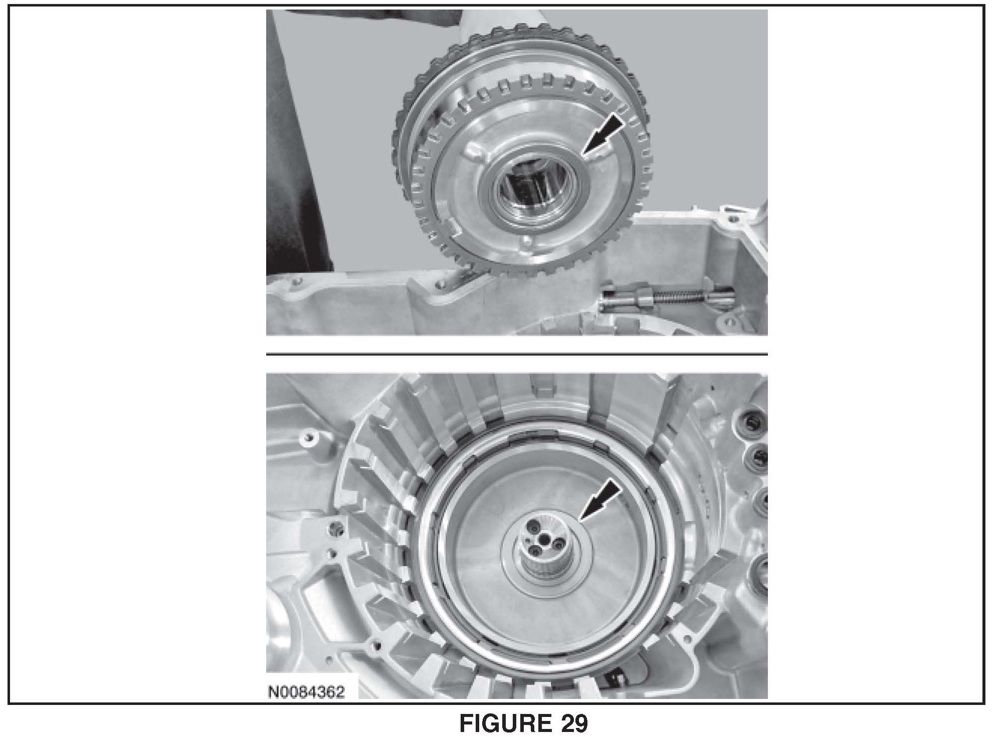 29. NOTE: The forward (1 2, 3, 4) clutch snap ring is beveled. The beveled side of the snap ring goes up (flat side down).