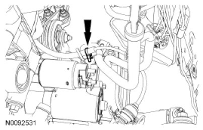 8. Remove the selector lever cable retainer from the transmission fluid filler tube.