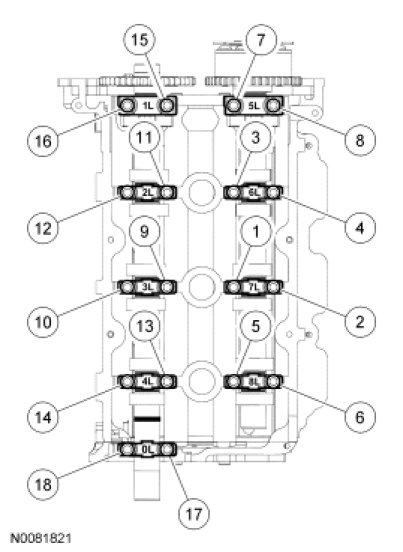 Tighten the LH camshaft bearing cap bolts in the sequence shown in 2 stages.Stage 1: Tighten to 10 Nm (89 lb-in).