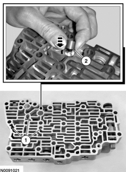 4. NOTICE: Remove the valves by tapping the valve body on the palm of the hand to slide the valves out of the bores or by threading a 4-mm bolt into the valves and pulling them out. It may be necessary to remove the valves and springs using a pick. If it is necessary to use a pick, use extreme caution to prevent damaging the valves or valve bores. If necessary, disassemble parts of the main control valve body in small groups. Take special care when handling the main control components, since they are the most precise and delicate parts of the transaxle. Neatly arrange the parts as they are removed to avoid mixing similar pieces.