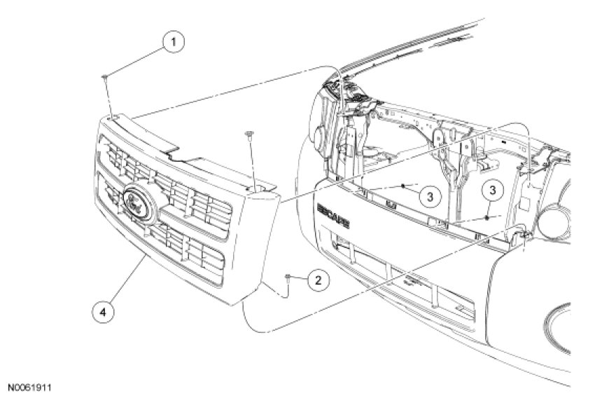 5. Push outward on the 12 radiator grille clips to release the radiator grille from the bumper cover and remove the radiator grille.