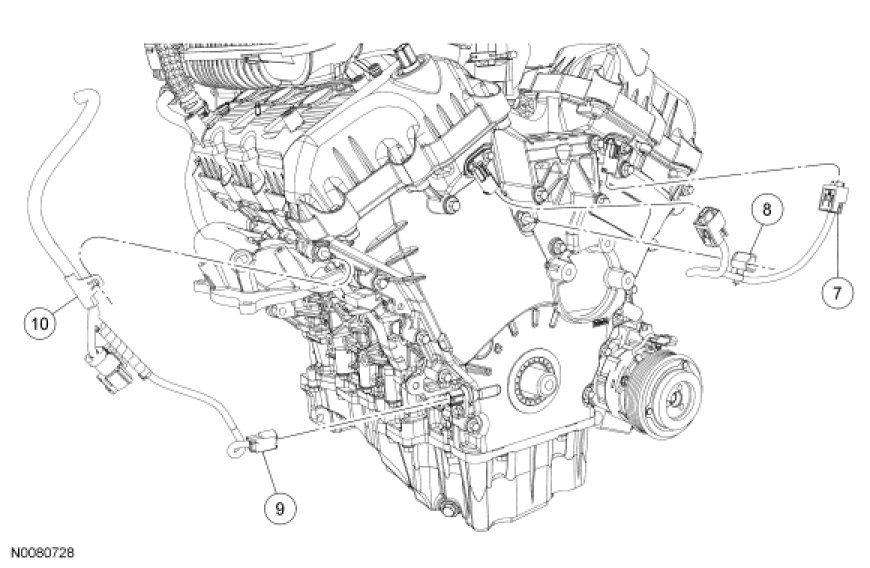 10. Disconnect the 2 Camshaft Position (CMP) sensor electrical connectors and detach the wiring harness retainer from the engine front cover stud bolt.