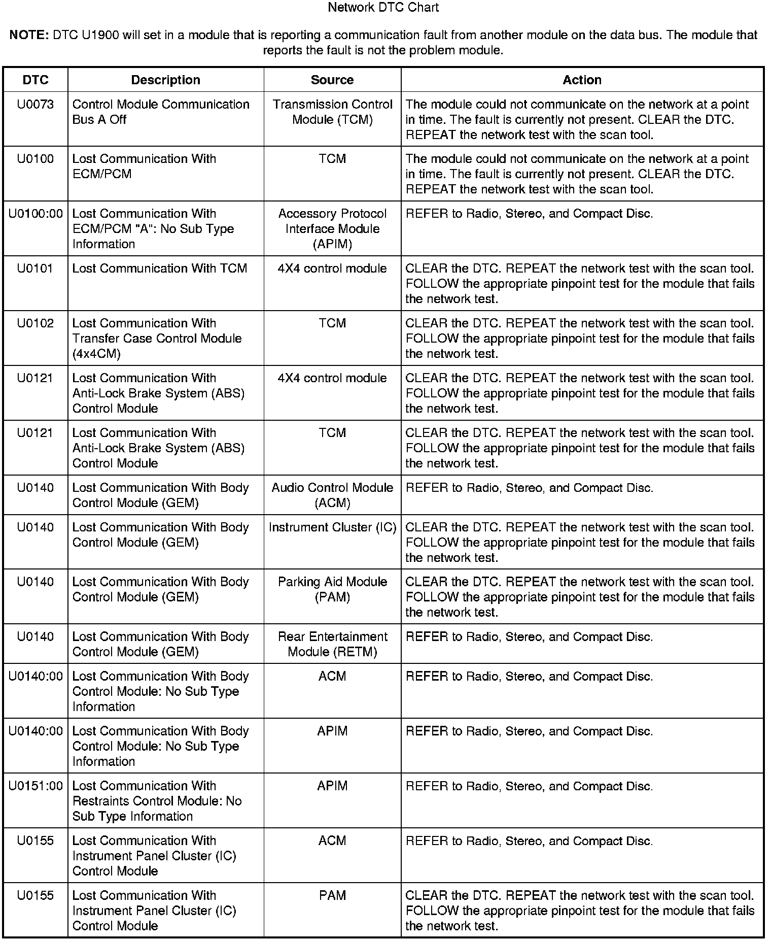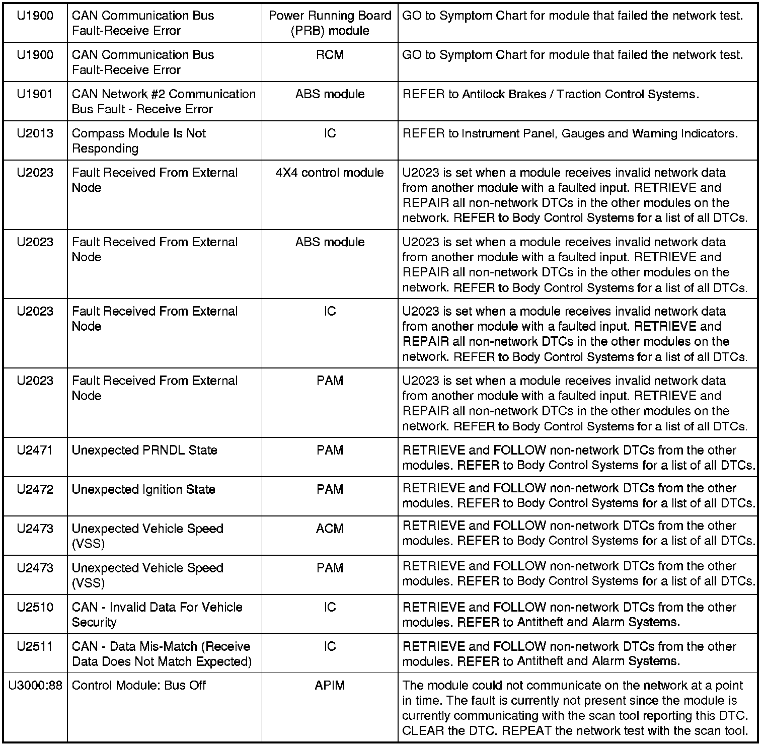 NOTE: Network DTCs (U-codes) are often a result of intermittent concerns such as damaged wiring or low battery voltage occurrences. Additionally, vehicle service procedures such as module reprogramming will often set network DTCs. Replacing a module to resolve a network DTC is unlikely to resolve the concern. To prevent repeat network DTC concerns, inspect all network wiring, especially connectors. Test the vehicle battery, refer to Battery.