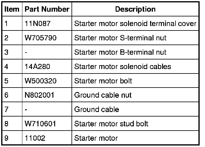 WARNING: Always disconnect the battery ground cable at the battery before disconnecting the starter motor battery terminal lead. If a tool is shorted at the starter motor battery terminal, the tool can quickly heat enough to cause a skin burn. Failure to follow this instruction may result in serious personal injury.