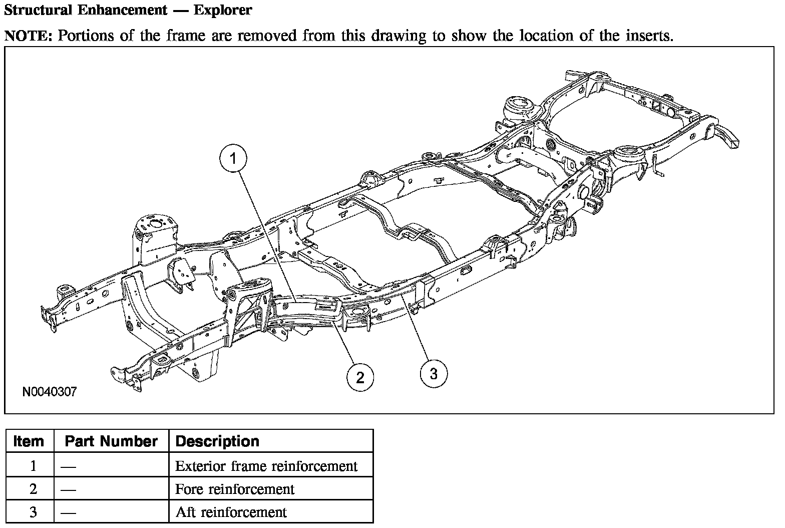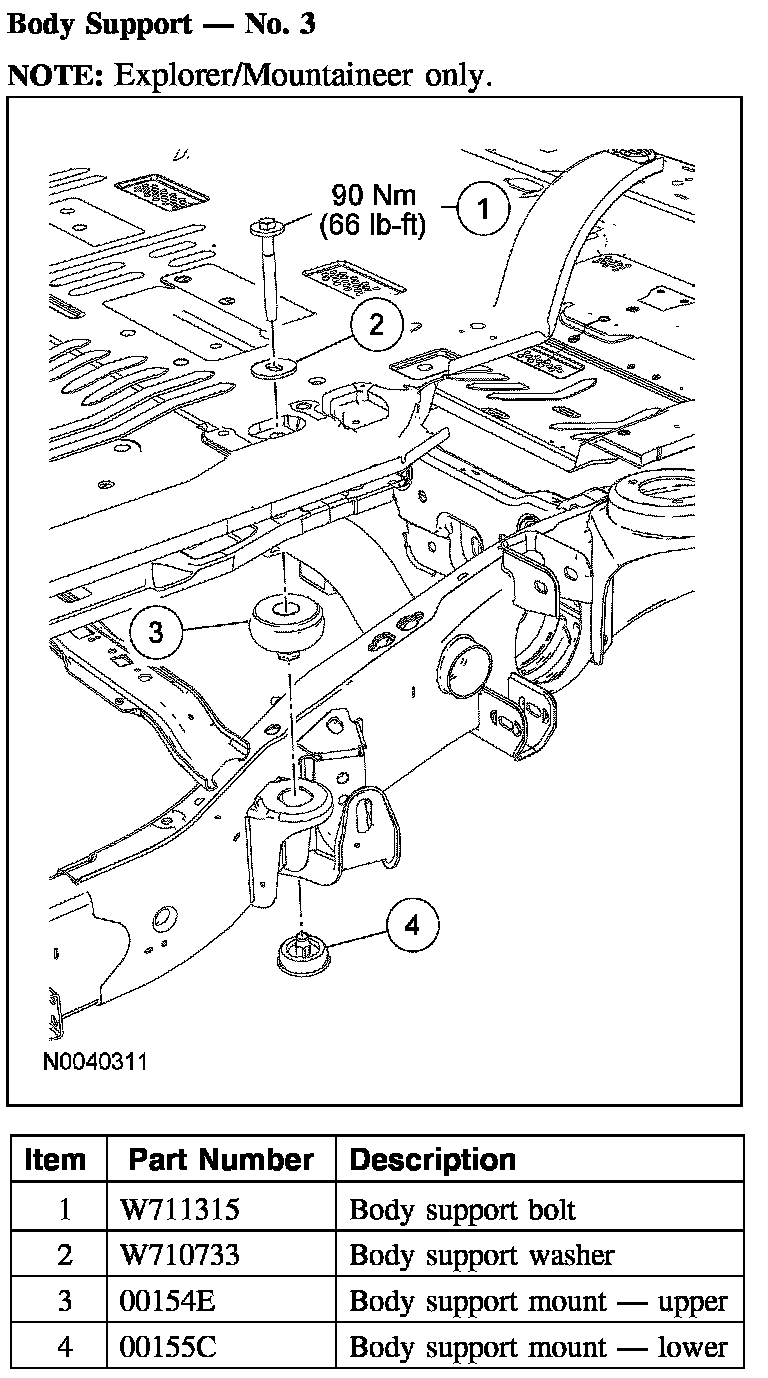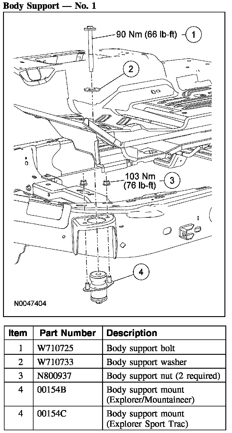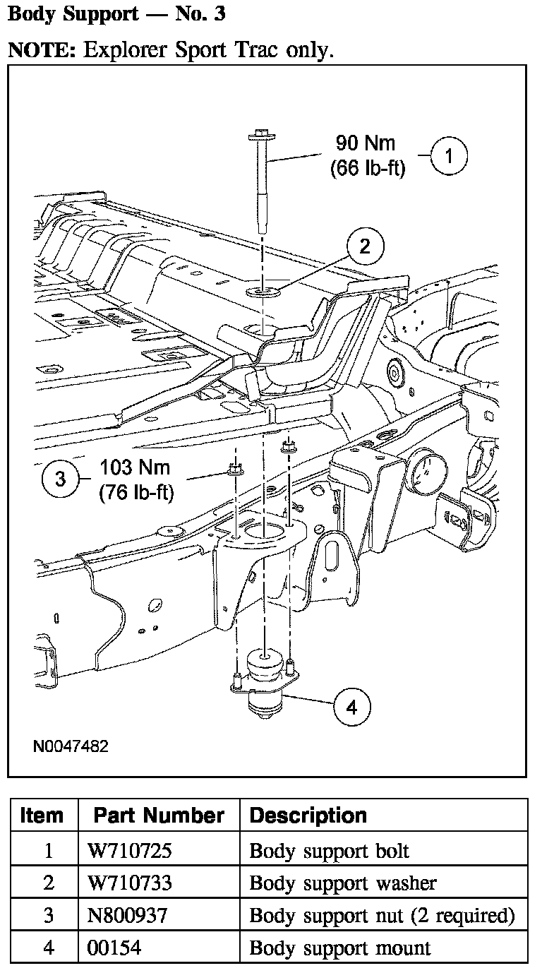 The frame consists of 2 steel-channel rails, 10 crossmembers for Explorer Sport Trac or 8 crossmembers for Explorer/Mountaineer including a front crossmember, transmission support crossmember and a rear crossmember (trailer hitch). New side rails and welded crossmembers, including the trailer hitch, are not installed separately. A front frame rail repair kit is available if the front rail is to be repaired and a rear crossmember (hitch) repair kit is available if the rear crossmember or rail is to be repaired.