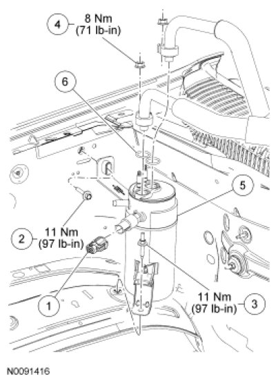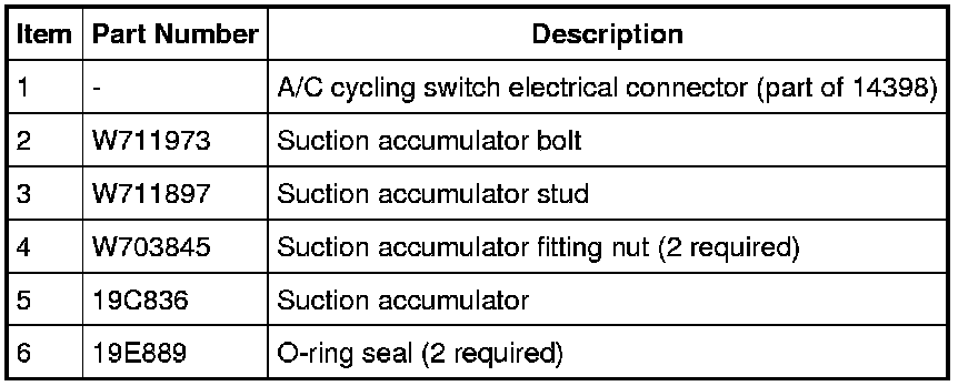 NOTE: Installation of a new suction accumulator is not required when repairing the A/C system, except when there is physical evidence of contamination from a failed A/C compressor or damage to the suction accumulator. Damage to the suction accumulator includes leaks in the suction accumulator, physical damage to the suction accumulator shell or desiccant, or moisture contamination. Moisture contamination results only from a complete loss of refrigerant, and equalization of the refrigerant system pressure with atmospheric pressure for a period longer than 1 hour. If even a slight amount of positive refrigerant pressure is present in the refrigerant system before repairs are carried out, the suction accumulator should not be replaced.