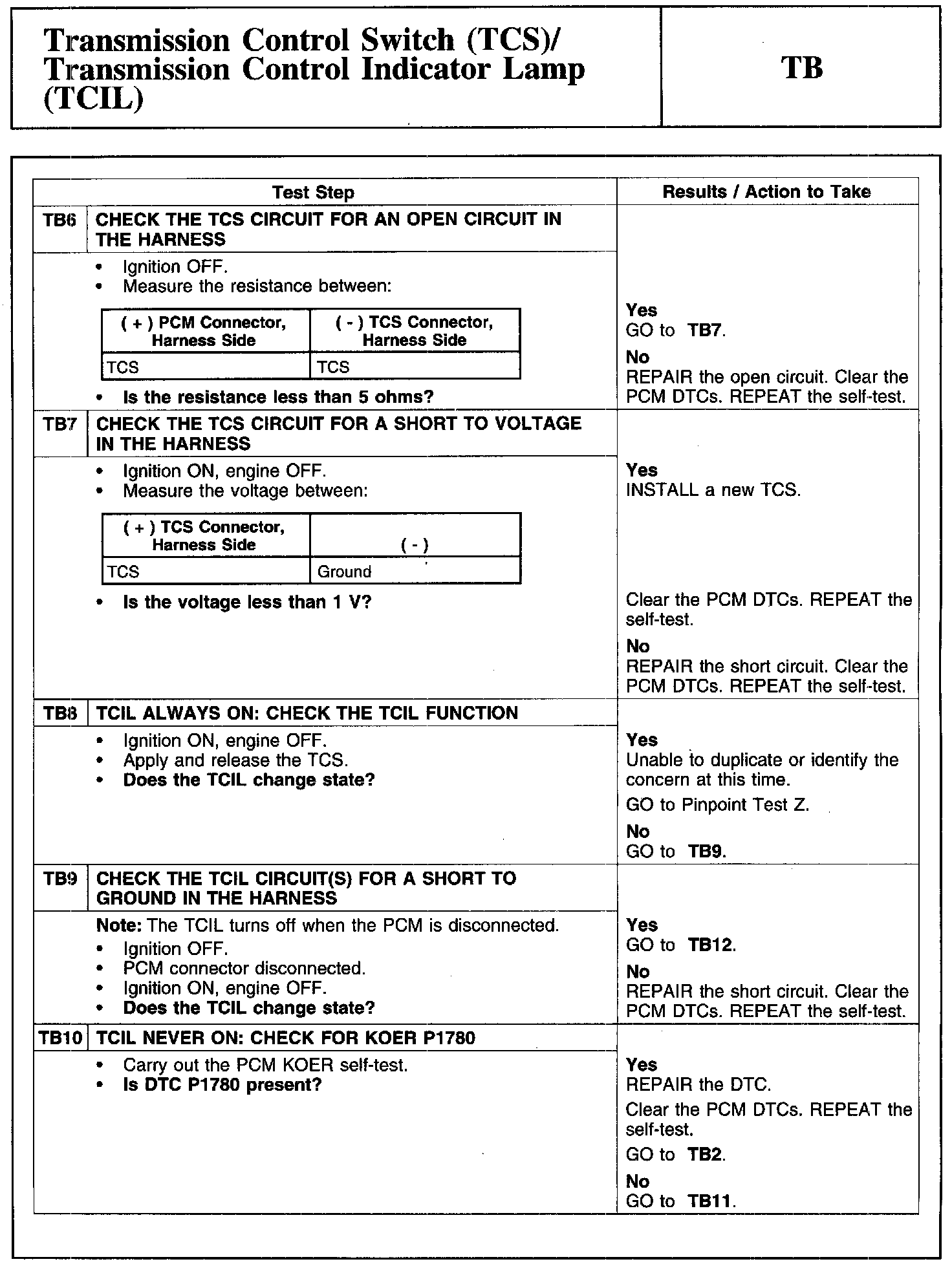 PINPOINT TEST TB: TRANSMISSION CONTROL SWITCH (TCS)/TRANSMISSION CONTROL INDICATOR LAMP (TCIL)
