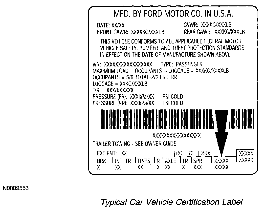 Base engine calibration information, sometimes referred to as the powertrain calibration, is located in the lower right corner of the vehicle certification label. Engine calibration information is limited to a maximum of 5 characters per line (2 lines maximum). Calibration information more than 5 characters long wraps to the second line of this field. Only the base calibration appears on this label. The revision level is no longer printed on the label. However, it can be found in the On-Line Automotive Service Information System (OASIS). For additional information on the vehicle certification label or engine calibration, refer to the Vehicle/Application and ID, Identification Codes.