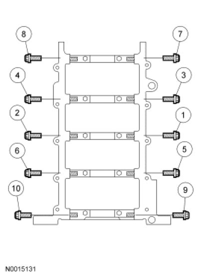 Tighten the 10 vertical main bearing cap fasteners in the sequence shown, in 2 stages.