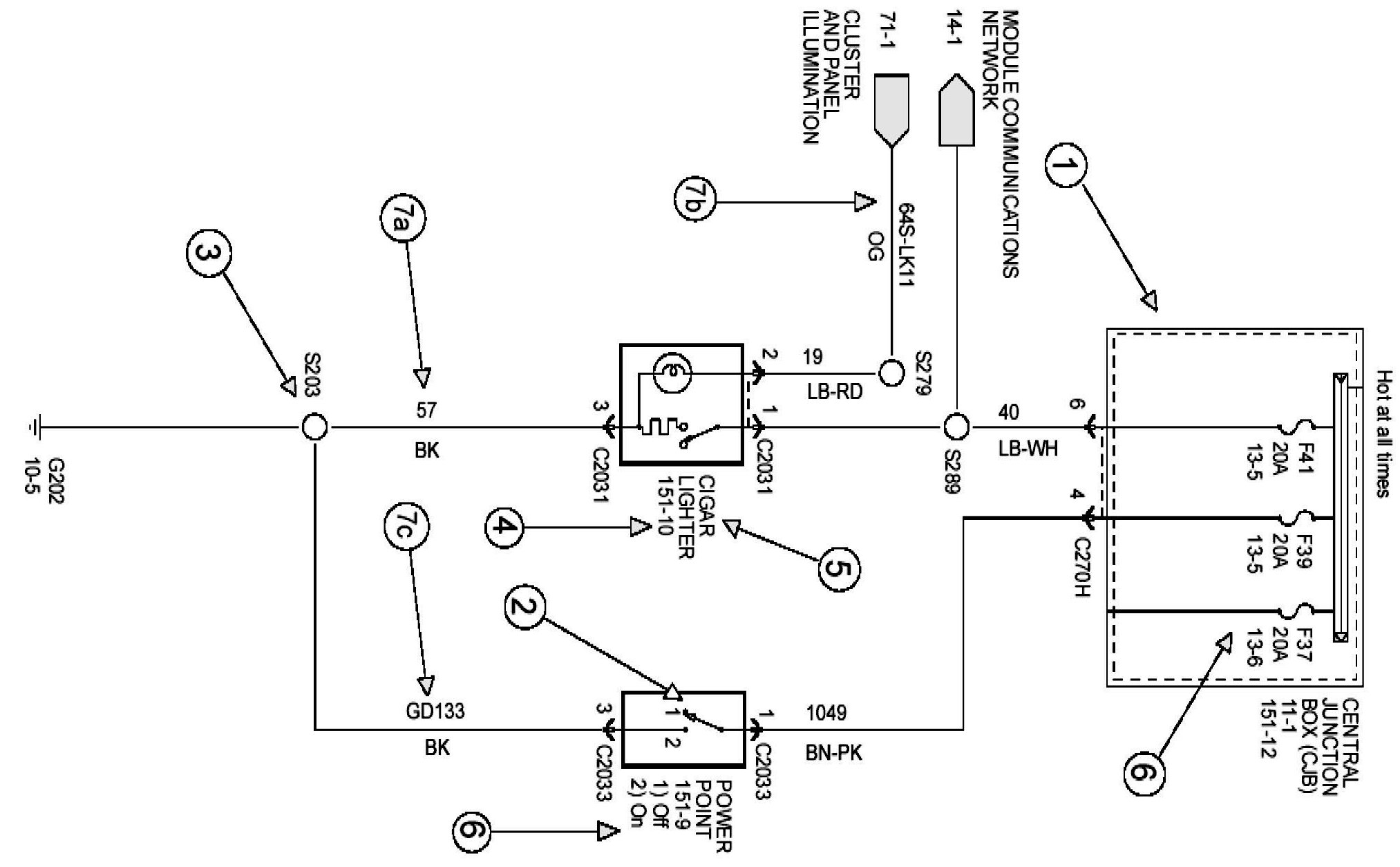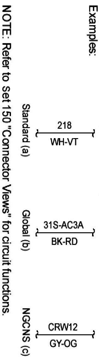 Ford Motor Company uses three different circuit numbering conventions: Standard Circuit Numbering System, Global Circuit Numbering System, and New Global Circuit Numbering System (NGCNS). With each, the circuit number (which identifies a specific circuit function) is followed by the wire color.