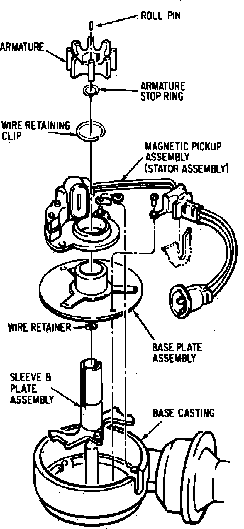 The distributor sends a signal to the ignition module which controls the timing of the spark to the spark plugs. The signal is created when the armature, attached to the distributor shaft, rotates past the stator assembly. The rotating of the armature causes a fluctuations in a magnetic field produced by the stator assembly magnet. These fluctuations cause a voltage in the stator assembly pick-up coil. This signal is connected to the module by the wiring harness.